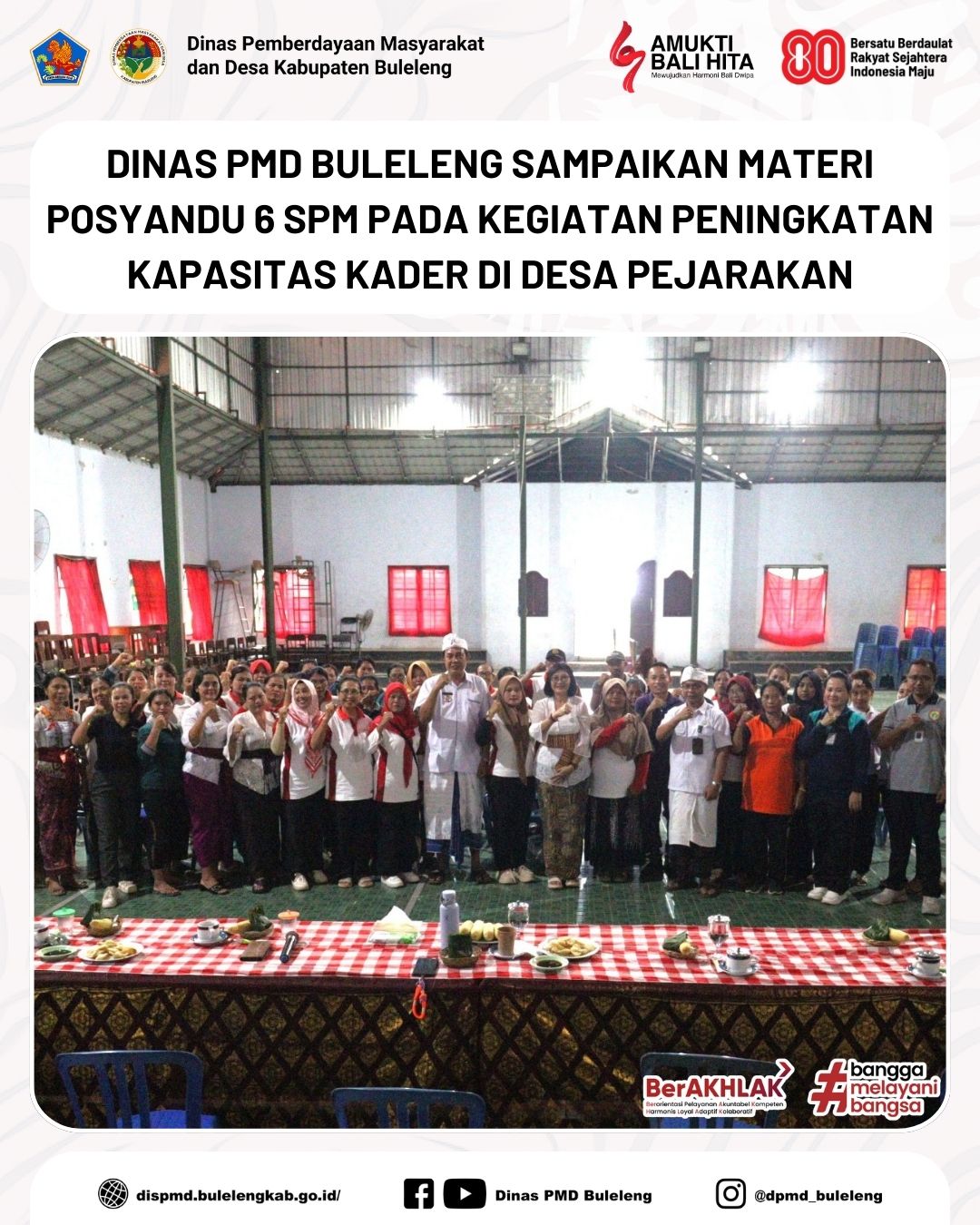 Buleleng, 19 Desember 2025 - Dinas Pemberdayaan Masyarakat dan Desa (PMD) Kabupaten Buleleng melalui Bidang Lembaga Kemasyarakatan Desa, Adat dan Usaha Ekonomi Masyarakat (LKDA & UEM) menghadiri kegiatan Peningkatan Kapasitas Kader Posyandu Era Baru dalam Layanan 6 Standar Pelayanan Minimum (SPM). Hadir sebagai narasumber, Fungsional Penggerak Swadaya Masyarakat Dinas PMD Kabupaten Buleleng, Dewa Nyoman Suarjana Putra. Kegiatan ini berlangsung di GOR Wijaya Kusuma, Desa Pejarakan.