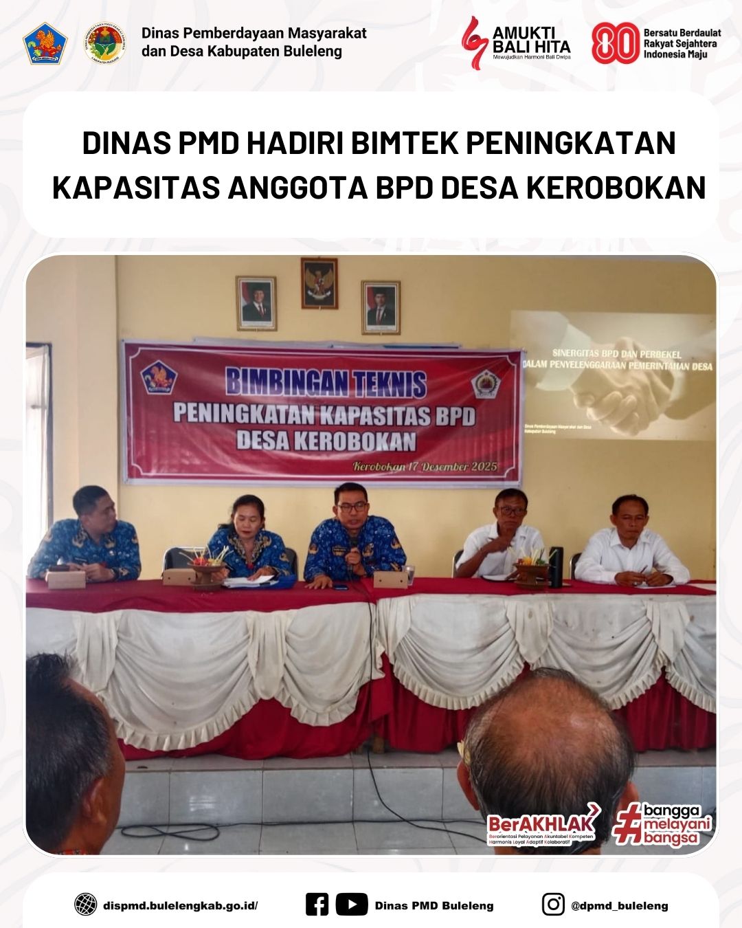 Buleleng, 17 Desember 2025 - Dinas Pemberdayaan Masyarakat dan Desa melalui Bidang Pemerintahan Desa menghadiri kegiatan bimbingan teknis peningkatan kapasitas anggota Badan Permusyawaratan Desa (BPD) yang dilaksanakan di Aula Kantor Desa Kerobokan, Kecamatan Sawan. Kegiatan ini dihadiri oleh Kepala Bidang Pemerintahan Desa Madong Hartono beserta staf, Kasi Pemerintahan dan Kasi Pelayanan Kecamatan Sawan, seluruh anggota BPD Desa Kerobokan, perangkat desa, bidan desa, serta penyuluh Bahasa Bali.