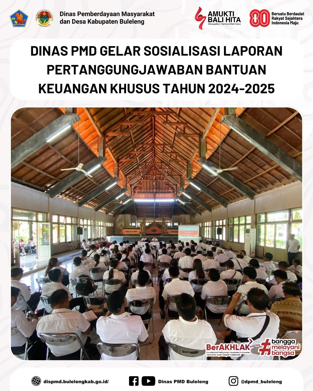 Buleleng, 12 November 2025 - Dinas Pemberdayaan Masyarakat dan Desa (PMD) Kabupaten Buleleng melalui Bidang Penataan dan Kerjasama Desa (PKD) menyelenggarakan kegiatan Sosialisasi Laporan Pertanggungjawaban (LPJ) Bantuan Keuangan Khusus (BKK) yang berlangsung di Gedung Wanita Laksmi Graha, Singaraja.