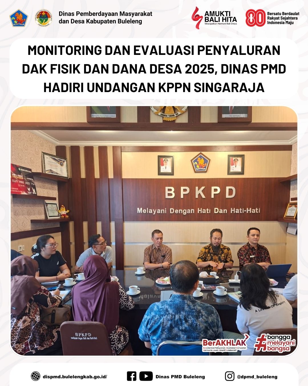 Buleleng, 14 November 2025 - Dinas Pemberdayaan Masyarakat dan Desa (PMD) Kabupaten Buleleng, melalui Staf Bidang Pemerintahan Desa, Kadek Sadnyana dan Putu Radyati Sugiadnyana, menghadiri kegiatan Monitoring dan Evaluasi Penyaluran DAK Fisik dan Dana Desa Tahun 2025 pada Pemerintah Daerah lingkup KPPN Singaraja. Kegiatan ini dilaksanakan di Ruang Kepala Badan Kantor BPKPD Kabupaten Buleleng.