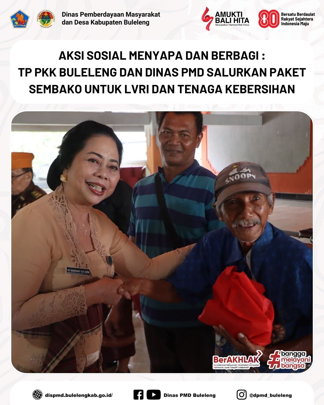 Kepala Dinas PMD Kabupaten Buleleng, Made Supartawan, dalam laporannya menyampaikan bahwa aksi sosial ini merupakan bentuk kepedulian TP PKK Kabupaten Buleleng kepada para penerima manfaat, yaitu 20 orang anggota Legiun Veteran Republik Indonesia (LVRI) dan 20 orang tenaga kebersihan dari Dinas Lingkungan Hidup.