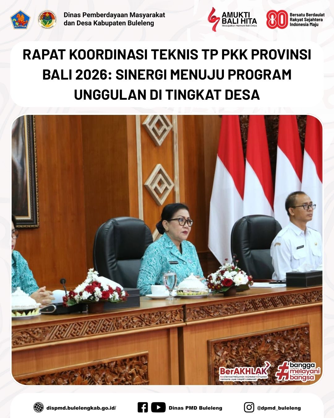 Denpasar, 7 Januari 2026 - Ketua Tim Penggerak PKK Provinsi Bali, Ny. Putri Koster, memimpin Rapat Koordinasi Teknis (Rakornis) Kegiatan TP PKK Tahun 2026 yang digelar di Ruang Rapat Gedung Kertha Sabha, Jaya Sabha Denpasar. Acara ini dihadiri oleh Ketua TP PKK Kabupaten/Kota se-Bali, termasuk Ketua TP PKK Kabupaten Buleleng, Ny. Wardhany Sutjidra, bersama jajaran TP PKK Kabupaten Buleleng dan Perangkat Daerah terkait, termasuk Kepala Dinas PMD Kabupaten Buleleng, Made Supartawan.