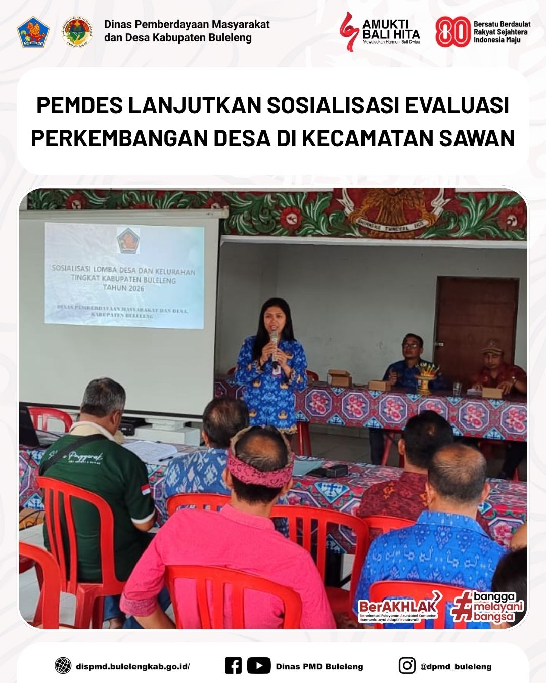 Buleleng, 28 Oktober 2025 - Sebagai upaya mempersiapkan pelaksanaan Evaluasi Perkembangan Desa dan Perlombaan Desa/Kelurahan Tingkat Kabupaten Buleleng Tahun 2026, Dinas Pemberdayaan Masyarakat dan Desa (PMD) melalui Bidang Pemerintahan Desa (Pemdes) kembali menggelar kegiatan sosialisasi pada Selasa, 28 Oktober 2025.