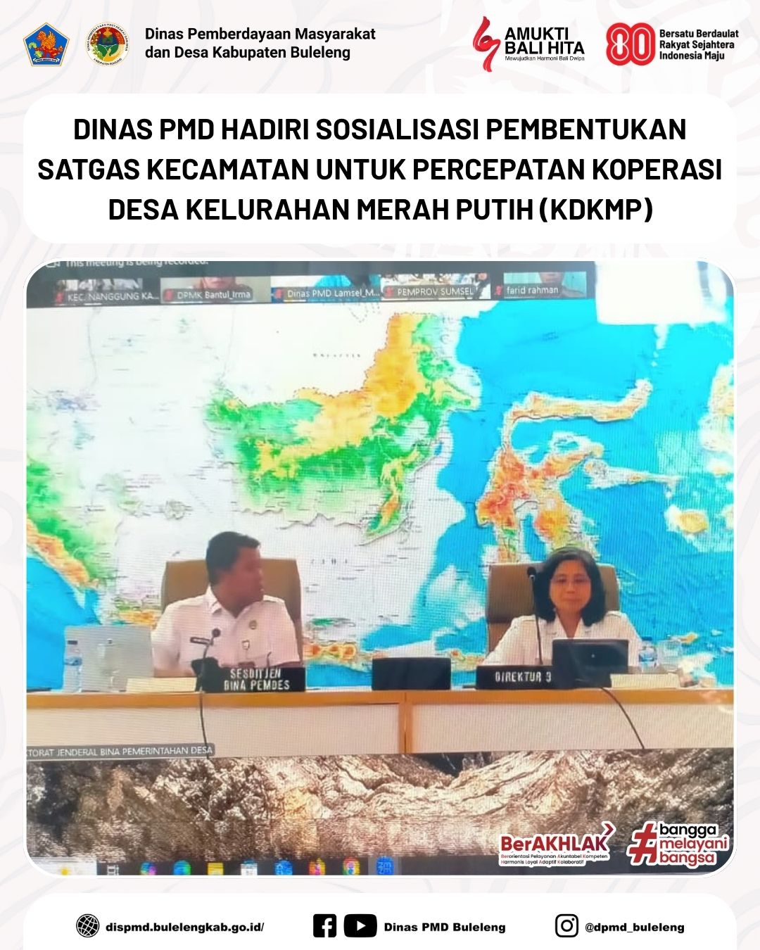 Buleleng, 8 Oktober 2025 - Dinas Pemberdayaan Masyarakat dan Desa (PMD) Kabupaten Buleleng yang diwakili oleh Staf Bidang Lembaga Kemasyarakatan Desa, Adat dan Usaha Ekonomi Masyarakat (LKDA-UEM), I Made Aryana, menghadiri secara daring kegiatan Sosialisasi Surat Edaran Menteri Dalam Negeri Nomor 500.3/5222/SJ tentang Satuan Tugas Kecamatan dalam Percepatan Pembentukan dan Pengembangan Koperasi Desa Kelurahan Merah Putih (KDKMP).