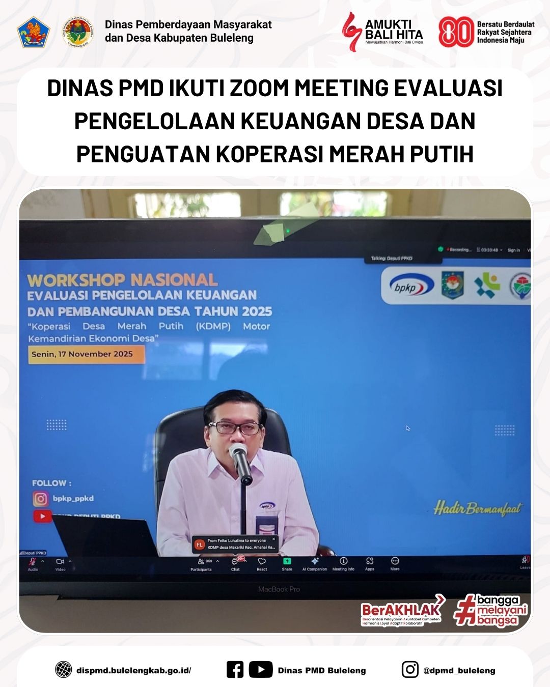 Buleleng, 17 November 2025 - Dinas Pemberdayaan Masyarakat dan Desa (PMD) Kabupaten Buleleng yang diwakili oleh Fungsional Penggerak Swadaya Masyarakat (PSM), Dewa Nyoman Suarjana Putra, mengikuti Zoom Meeting bertema “Evaluasi Pengelolaan Keuangan Pembangunan Desa Tahun 2025 dan Koperasi Desa Merah Putih (KDMP) sebagai Motor Kemandirian Ekonomi Desa.” Kegiatan ini membahas secara komprehensif peran pemerintah daerah dan desa dalam mendorong keberhasilan KDMP, termasuk strategi pengawalan pembentukan dan operasionalisasi koperasi sebagai lembaga ekonomi desa yang diharapkan mampu memperkuat kemandirian dan kesejahteraan masyarakat. Narasumber menekankan pentingnya sinergi dalam pembentukan KDMP, mulai dari pendampingan awal, koordinasi lintas pihak, hingga penguatan manajemen operasional agar koperasi dapat berjalan efektif dan berkelanjutan.