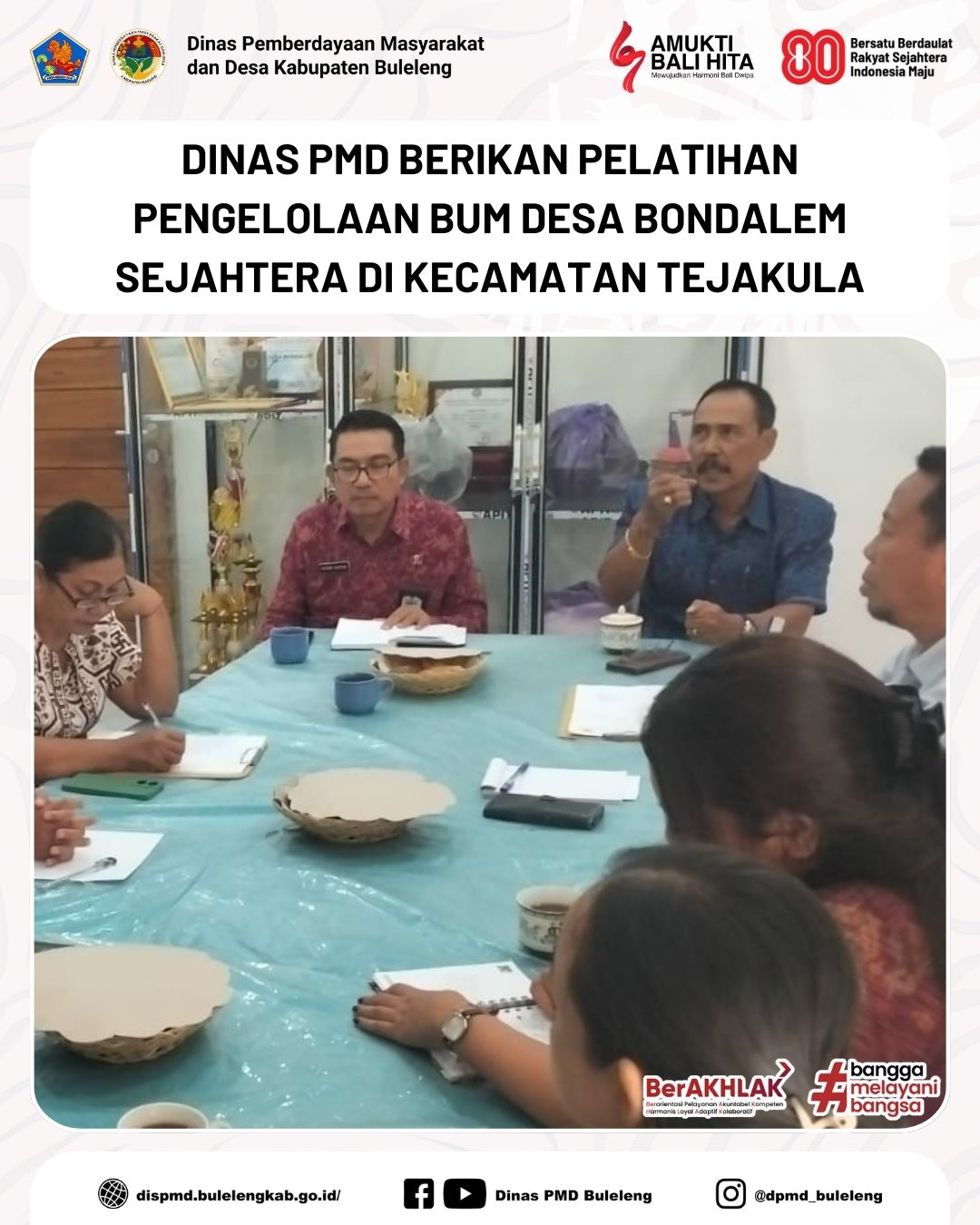 Buleleng, 23 Desember 2025 - Dinas Pemberdayaan Masyarakat dan Desa (PMD) menghadiri kegiatan Pelatihan Pengelolaan BUM Desa Bondalem Sejahtera yang dilaksanakan pada Selasa (23/12) bertempat di Ruang Rapat Kantor Perbekel Bondalem, Kecamatan Tejakula. Dalam kegiatan ini, Dinas PMD diwakili oleh Kepala Bidang Pemerintahan Desa (Pemdes), Madong Hartono, bersama staf, yang hadir sebagai narasumber.