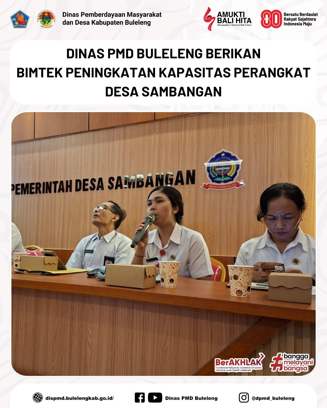 Buleleng, 10 Desember 2025 - Dinas Pemberdayaan Masyarakat dan Desa (PMD) Kabupaten Buleleng melalui Bidang Pemerintahan Desa menghadiri undangan sebagai narasumber dalam kegiatan Bimbingan Teknis (Bimtek) Peningkatan Kapasitas Perangkat Desa Sambangan. Kegiatan berlangsung di Ruang Rapat Kantor Perbekel Desa Sambangan, Kecamatan Sukasada, dan diikuti oleh Kasi Pemerintahan Kecamatan Sukasada, Perbekel, Perangkat Desa beserta staf, serta anggota BPD Desa Sambangan.
