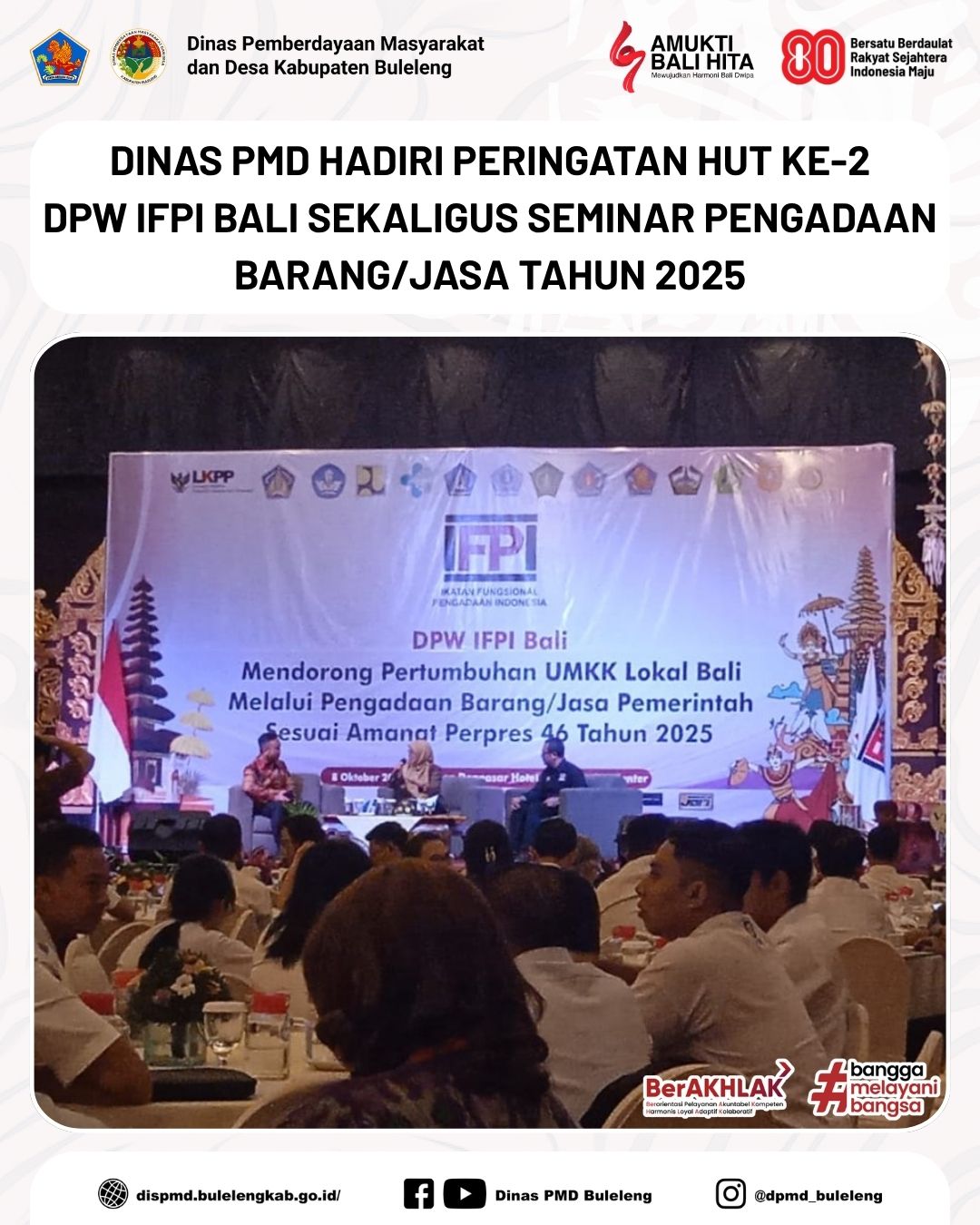 Denpasar, 8 Oktober 2025 - Dinas Pemberdayaan Masyarakat dan Desa (PMD) Kabupaten Buleleng yang diwakili oleh Kasubbag Umum, Made Desi Widiarsini, S.E., didampingi Staf, Komang Sukatama, menghadiri acara peringatan Hari Jadi ke-2 Dewan Pimpinan Wilayah Ikatan Fungsional Pengadaan Indonesia (DPW IFPI) Bali yang dirangkaikan dengan seminar pengadaan barang/jasa. Kegiatan ini mengusung tema “DPW IFPI Bali Mendorong Pertumbuhan UMKK Lokal Bali melalui Pengadaan Barang/Jasa Pemerintah sesuai Amanat Perpres Nomor 46 Tahun 2025”, bertempat di Aston Hotel & Convention Center, Denpasar.