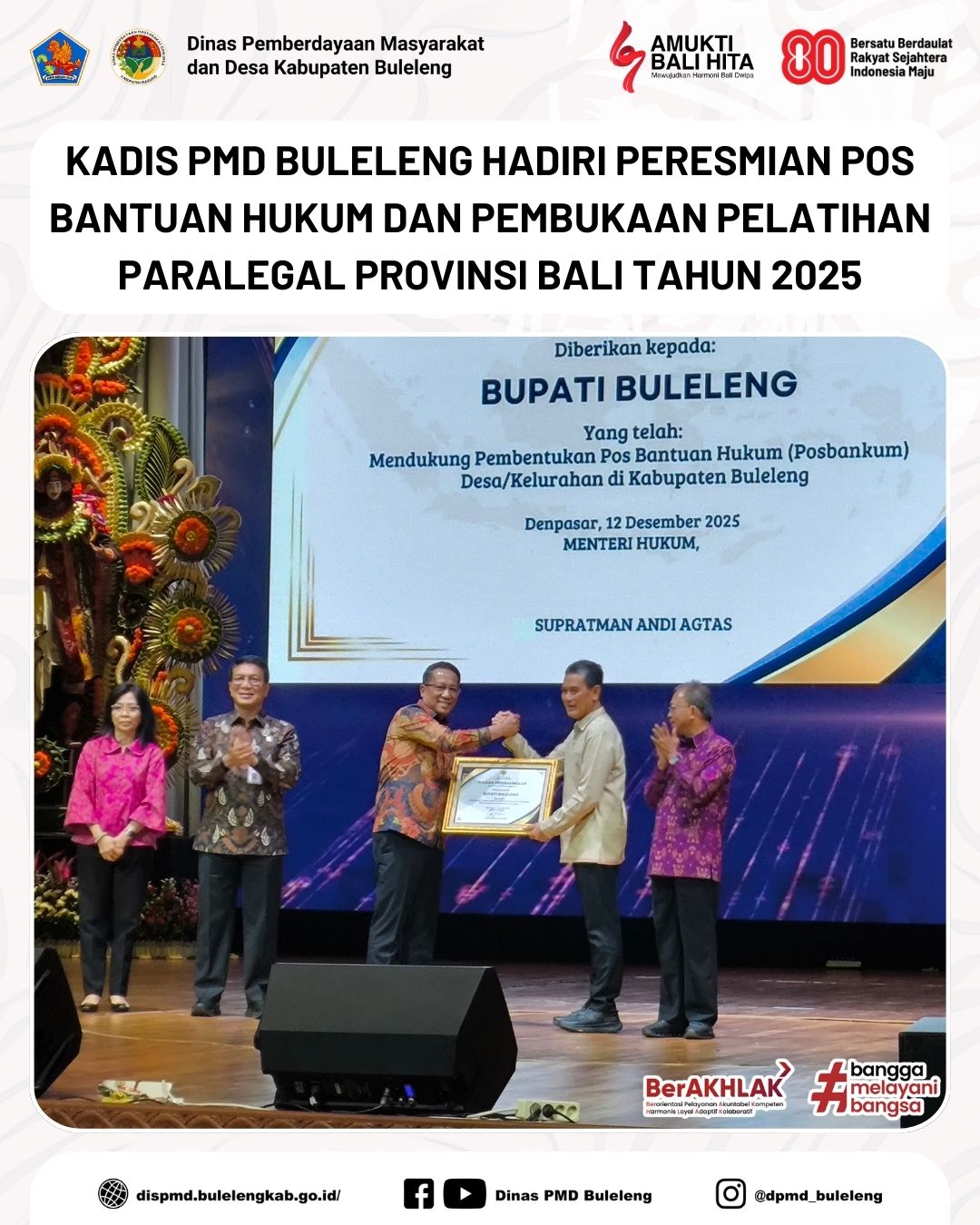 Badung, 12 Desember 2025 - Kepala Dinas Pemberdayaan Masyarakat dan Desa (PMD) Kabupaten Buleleng, Made Supartawan, pada Jumat (12/12) menghadiri acara Peresmian Pos Bantuan Hukum (Posbankum) dan Pembukaan Pelatihan Paralegal Provinsi Bali Tahun 2025. Kegiatan ini berlangsung di Balai Budaya Giri Nata Mandala, Pusat Pemerintahan Kabupaten Badung, dan dihadiri langsung oleh Gubernur Bali, Wayan Koster, serta Menteri Hukum dan HAM, Supratman Andi Agtas.