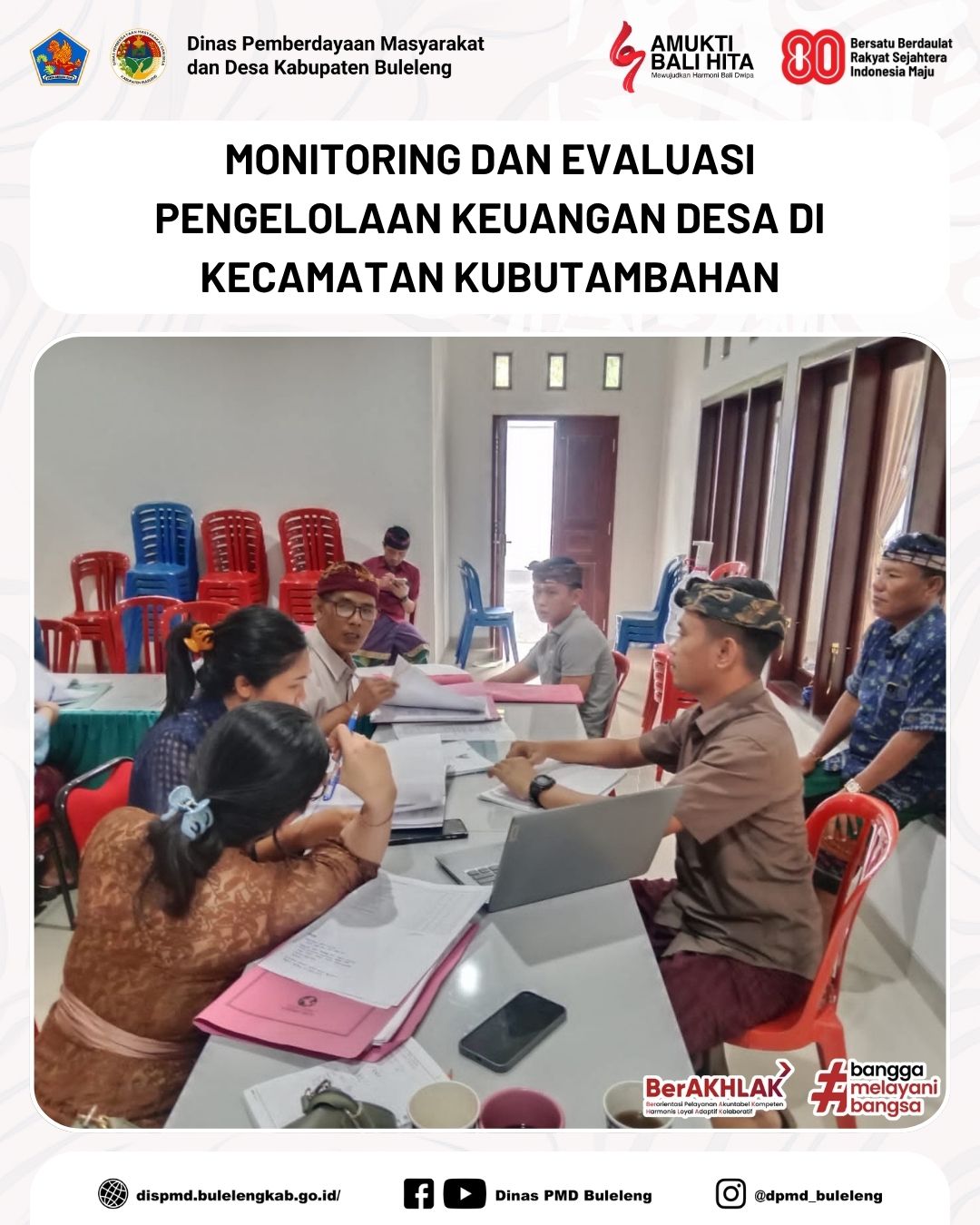 Buleleng, 13 November 2025 - Dinas Pemberdayaan Masyarakat dan Desa (PMD) Kabupaten Buleleng melalui Bidang Pemerintahan Desa (Pemdes) kembali melaksanakan kegiatan Monitoring dan Evaluasi (Monev) Pengelolaan Keuangan Desa Tahun 2025, dengan fokus pada pengadaan barang dan jasa di desa. Kegiatan kali ini dilaksanakan di Desa Bukti dan Desa Bengkala, Kecamatan Kubutambahan.