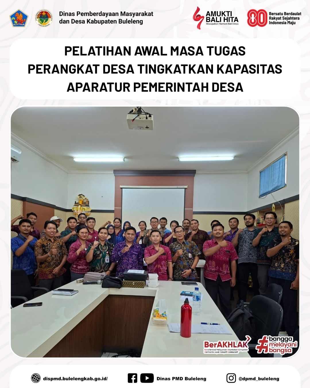 Buleleng, 26 September 2025 - Dinas Pemberdayaan Masyarakat dan Desa (PMD) Kabupaten Buleleng melalui Bidang Pemerintahan Desa menyelenggarakan Pelatihan Awal Masa Tugas Perangkat Desa yang berlangsung selama tiga hari, mulai Rabu hingga Jumat, 24–26 September 2025, bertempat di Ruang Rapat Dinas PMD.