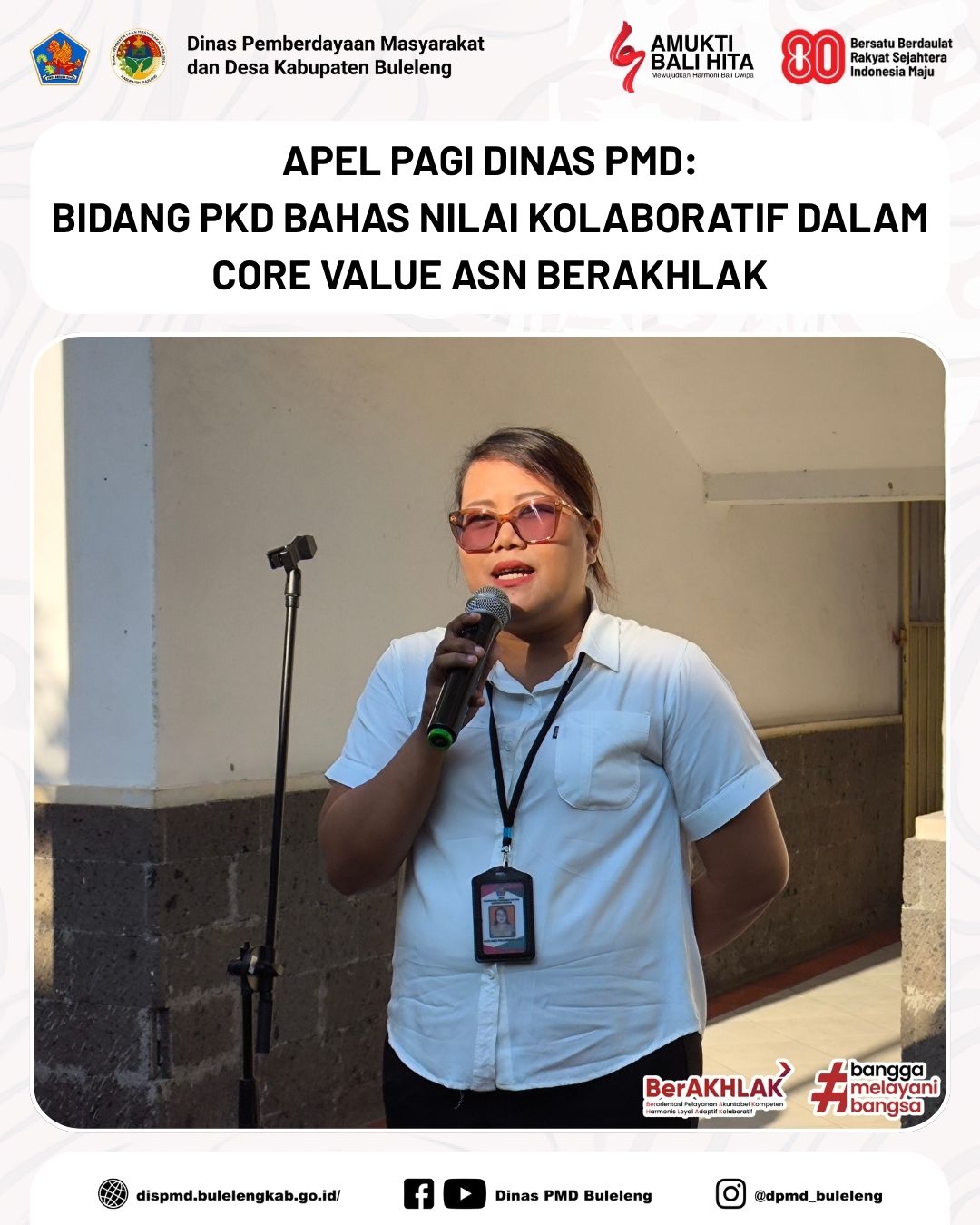 Buleleng, 8 Oktober 2025 - Dinas Pemberdayaan Masyarakat dan Desa (PMD) Kabupaten Buleleng kembali melanjutkan sosialisasi nilai-nilai dasar ASN BerAKHLAK dalam apel pagi yang berlangsung di halaman kantor Dinas PMD. Apel pagi kali ini dipimpin oleh Kepala Bidang Penataan dan Kerjasama Desa (PKD), I Rai Gede Arisudana.