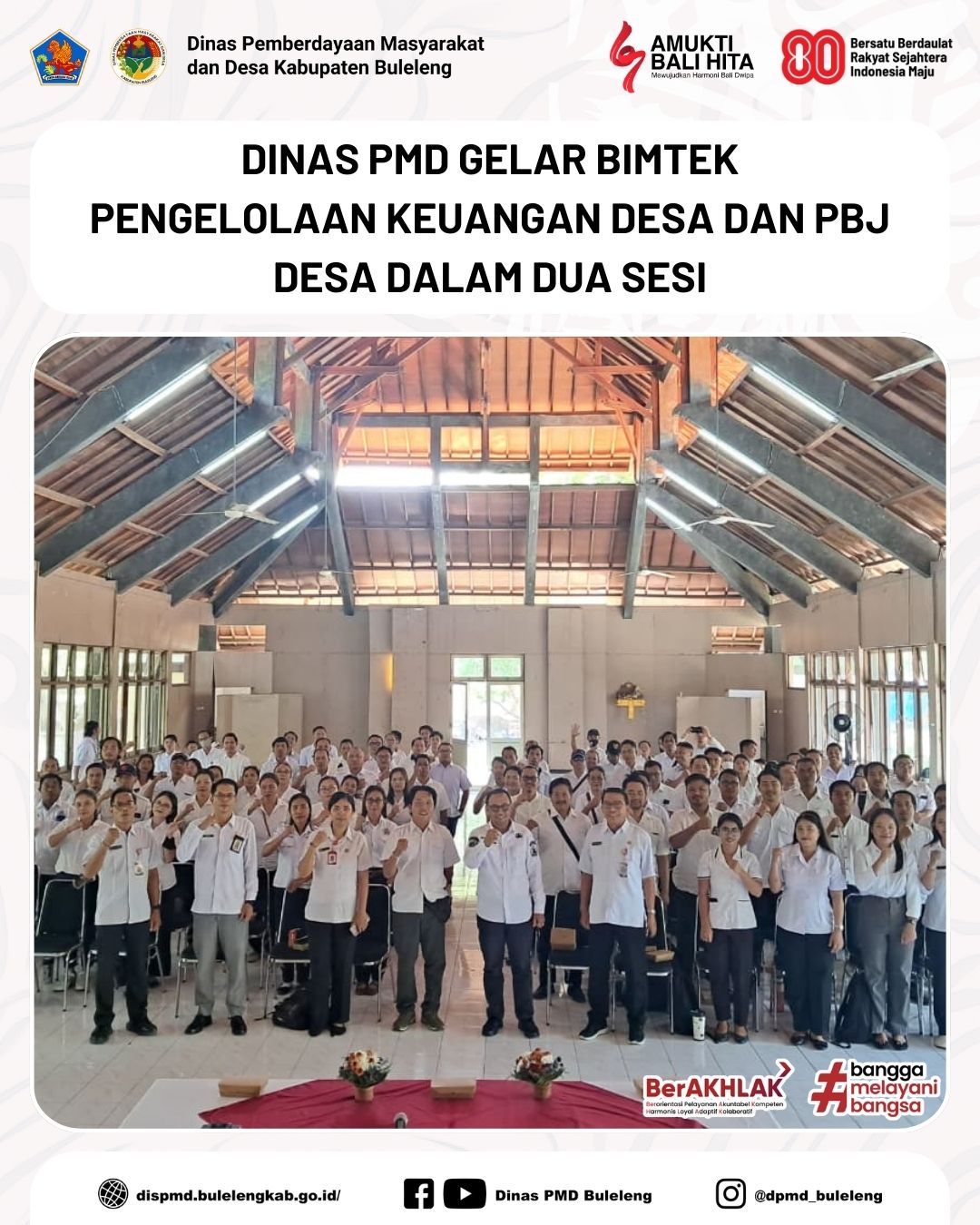 Buleleng, 26 November 2025 - Dinas Pemberdayaan Masyarakat dan Desa (PMD) Kabupaten Buleleng melalui Bidang Pemerintahan Desa (Pemdes) melaksanakan kegiatan Bimbingan Teknis (Bimtek) Pengelolaan Keuangan Desa dan Pengadaan Barang dan Jasa (PBJ) di Desa. Kegiatan ini dibagi menjadi dua sesi dan berlangsung di Gedung Wanita Laksmi Graha dengan melibatkan perangkat desa dari seluruh kecamatan.