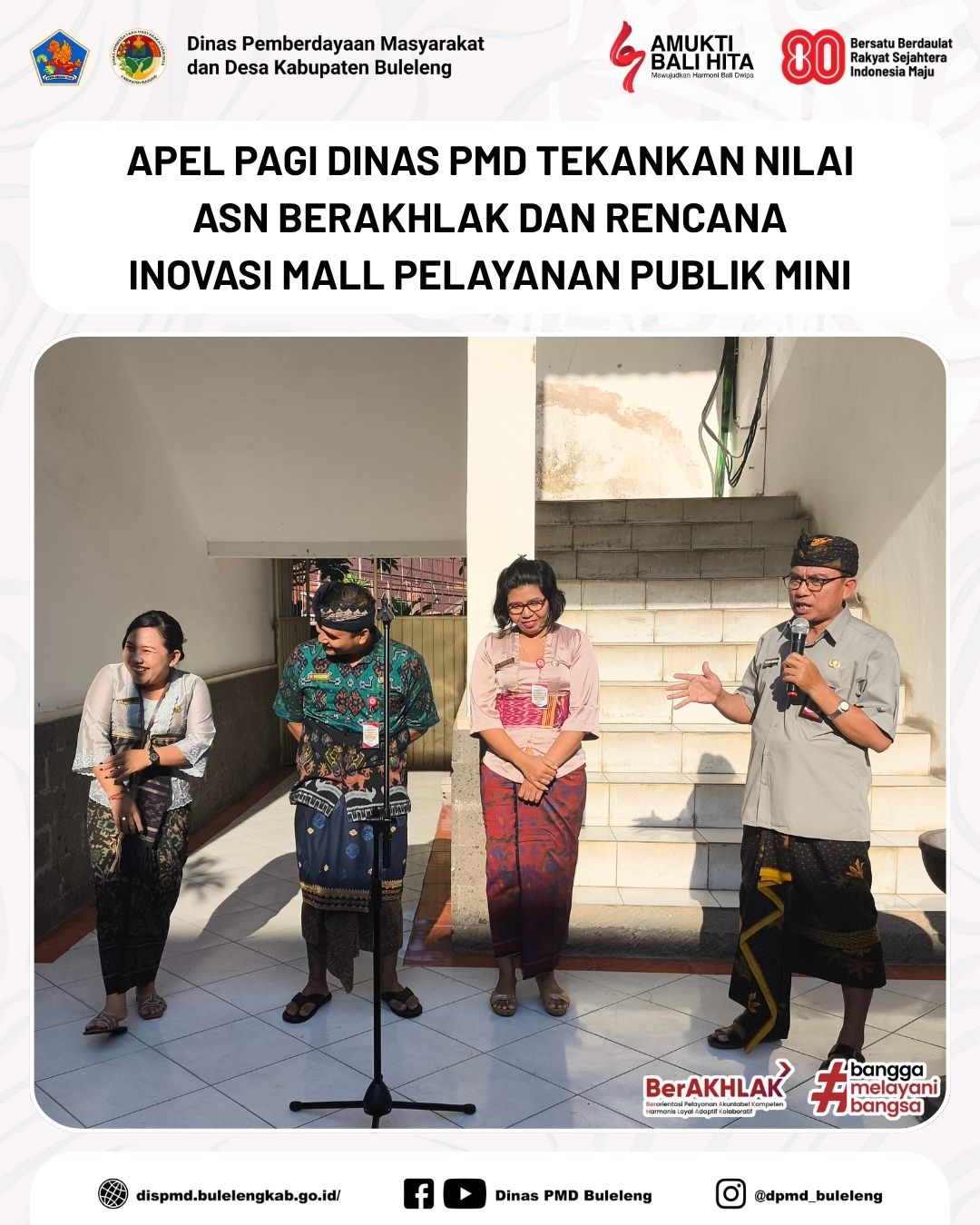Apel pagi kali ini tidak hanya menjadi sarana penyampaian informasi internal, tetapi juga momentum memperkuat nilai-nilai ASN BerAKHLAK serta komitmen Dinas PMD dalam meningkatkan kualitas pelayanan publik di Kabupaten Buleleng.