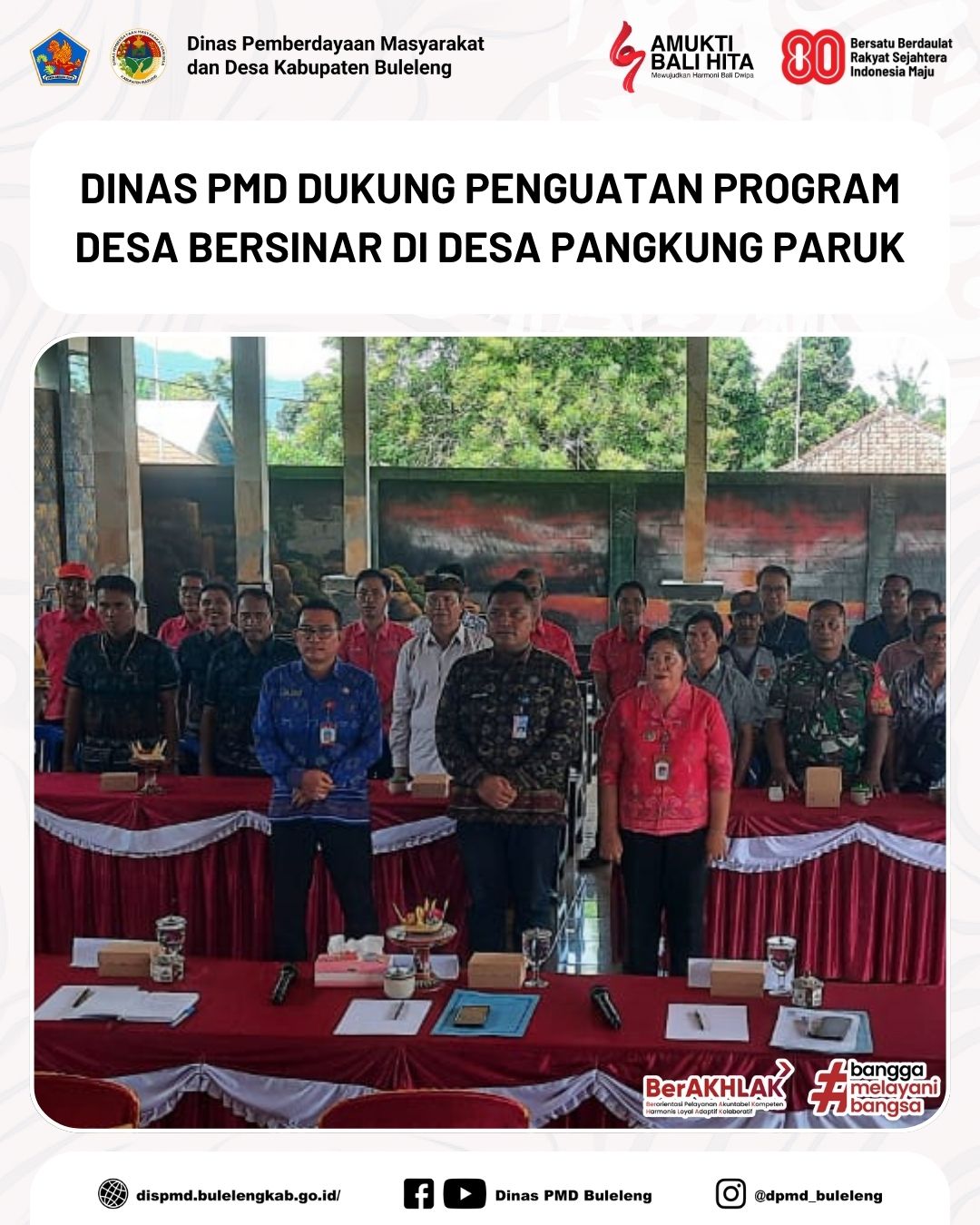 Buleleng, 11 November 2025 - Dinas Pemberdayaan Masyarakat dan Desa (PMD) Kabupaten Buleleng yang diwakili oleh Kepala Bidang Pemerintahan Desa, Madong Hartono, menghadiri kegiatan Monitoring dan Evaluasi Program Desa Bersih Narkoba (Desa Bersinar) yang dilaksanakan di Aula Kantor Desa Pangkung Paruk.