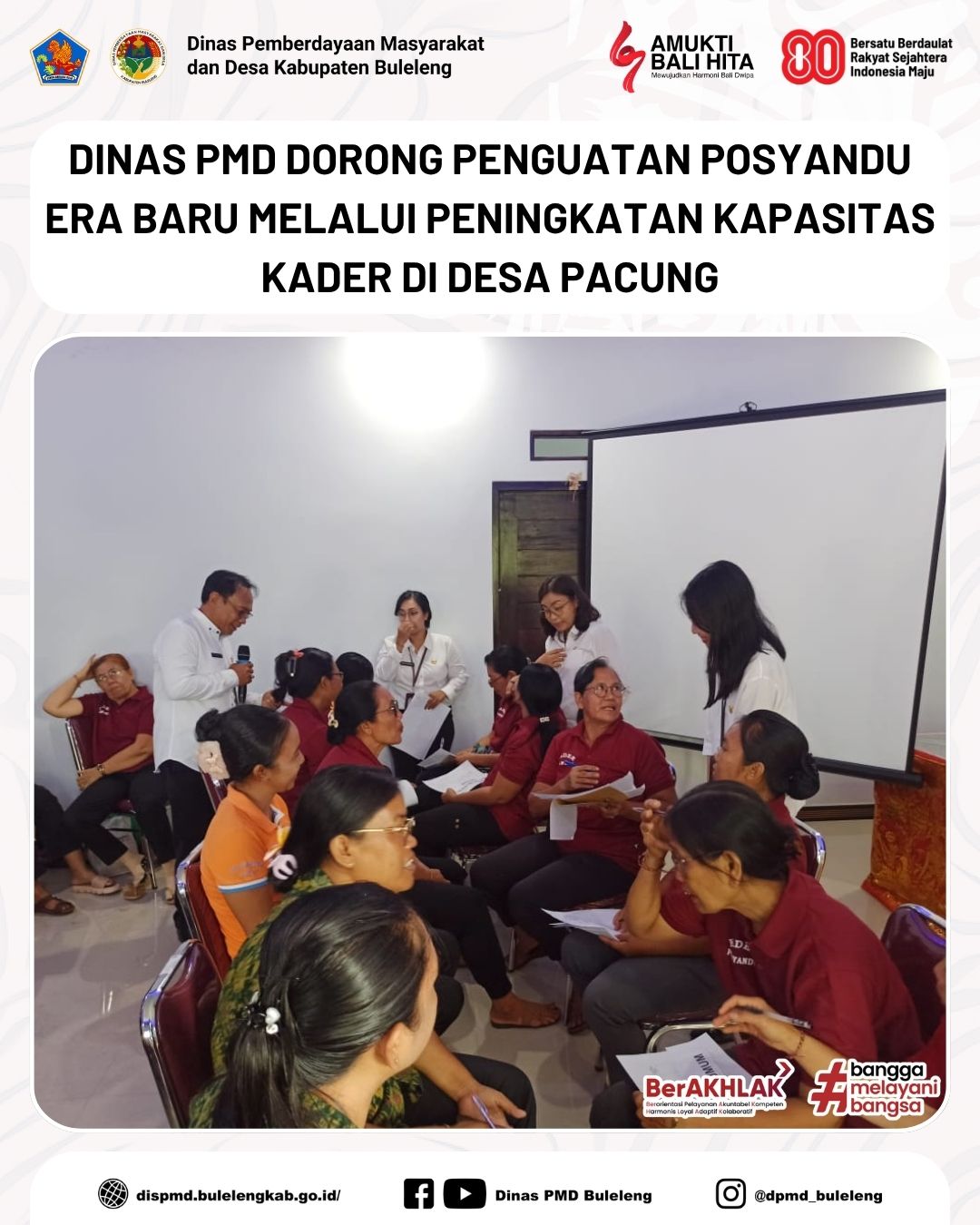 Buleleng, 12 November 2025 - Dinas Pemberdayaan Masyarakat dan Desa (PMD) Kabupaten Buleleng melalui Bidang Lembaga Kemasyarakatan Desa, Adat dan Usaha Ekonomi Masyarakat (LKDA & UEM) terus berperan aktif dalam penguatan Posyandu Era Baru berbasis enam Standar Pelayanan Minimum (SPM). Bertempat di Ruang Rapat Kantor Perbekel Desa Pacung, Kecamatan Tejakula, dilaksanakan kegiatan Peningkatan Kapasitas Kader Posyandu yang dihadiri oleh berbagai pihak terkait.