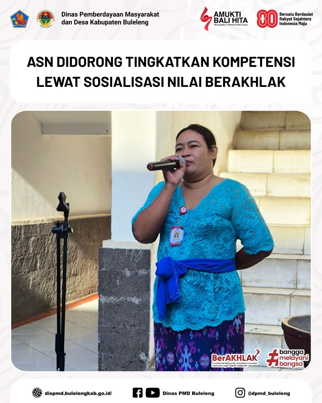 Buleleng, 25 September 2025 - Kegiatan apel pagi di Halaman Dinas PMD kembali diisi dengan sosialisasi nilai-nilai core value ASN BerAKHLAK. Apel kali ini dipimpin oleh Kabid Lembaga Kemasyarakatan Desa, Adat dan Usaha Ekonomi Masyarakat (LKDA-UEM), Ni Made Banu Deviati, dengan fokus pembahasan pada nilai ketiga, yakni Kompeten.