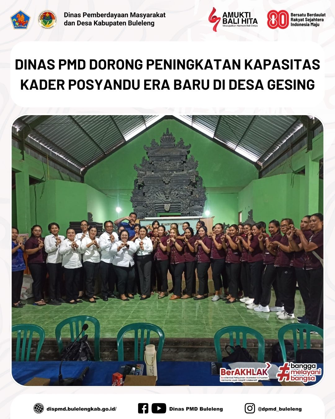 Buleleng, 11 November 2025 - Dinas Pemberdayaan Masyarakat dan Desa (PMD) Kabupaten Buleleng melalui Bidang Lembaga Kemasyarakatan Desa, Adat dan Usaha Ekonomi Masyarakat (LKDA & UEM) terus berperan aktif dalam mendukung implementasi Posyandu Era Baru dengan layanan enam Standar Pelayanan Minimal (SPM). Bertempat di Arena Serba Guna Desa Gesing, Kecamatan Banjar, kegiatan Peningkatan Kapasitas Kader Posyandu dilaksanakan dengan menghadirkan berbagai pihak terkait.