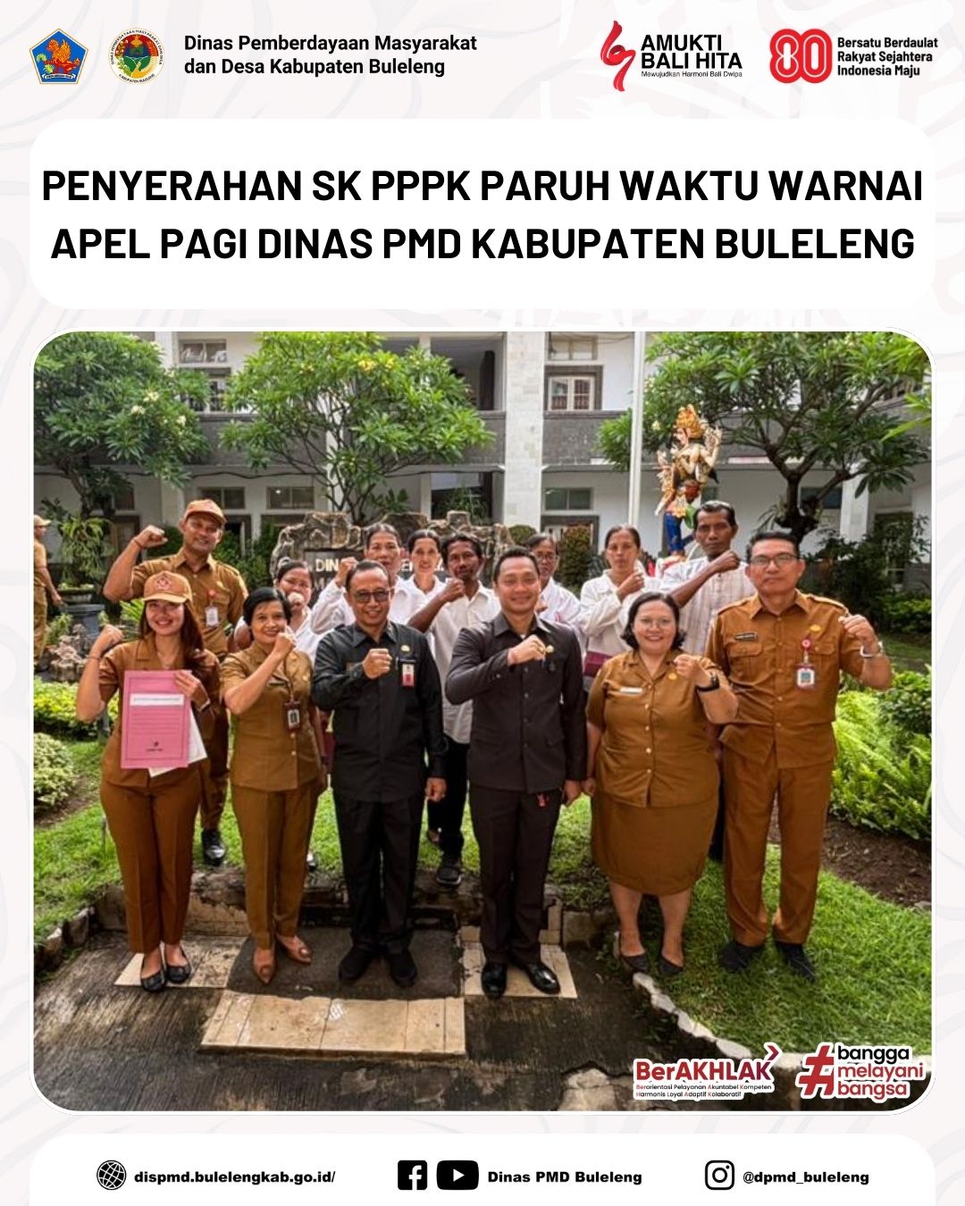 Buleleng, 24 November 2025 - Dinas Pemberdayaan Masyarakat dan Desa (PMD) Kabupaten Buleleng melaksanakan apel pagi yang dirangkaikan dengan acara penyerahan Surat Keputusan (SK) Pegawai Pemerintah dengan Perjanjian Kerja (PPPK) Paruh Waktu. Kegiatan ini merupakan tindak lanjut surat pemberitahuan dari Badan Kepegawaian dan Pengembangan Sumber Daya Manusia (BKPSDM) Kabupaten Buleleng terkait penyerahan SK PPPK Paruh Waktu.