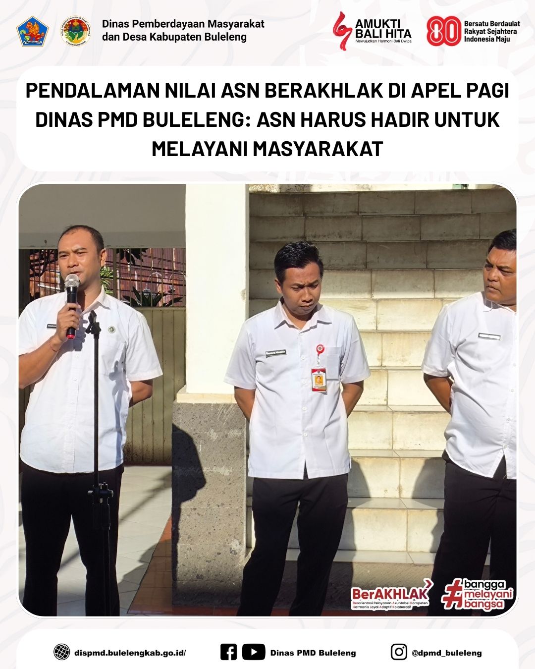 Buleleng, 15 Oktober 2025 - Dinas Pemberdayaan Masyarakat dan Desa (PMD) Kabupaten Buleleng kembali melaksanakan apel pagi rutin yang berlangsung di halaman kantor Dinas PMD pada Rabu (15/10). Apel kali ini dipimpin oleh Plt. Sekretaris Dinas sekaligus Kabid Pemerintahan Desa, Madong Hartono, dan diisi dengan pendalaman nilai ASN BerAKHLAK oleh Bidang Penataan dan Kerjasama Desa (PKD).