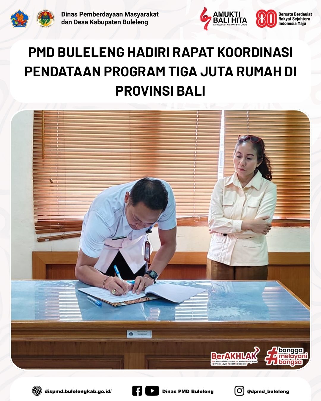 Denpasar, 22 Oktober 2025 - Mewakili Kepala Dinas Pemberdayaan Masyarakat dan Desa (PMD) Kabupaten Buleleng, Kepala Bidang Penataan dan Kerjasama Desa, I Rai Gede Arisudana, menghadiri Rapat Koordinasi Pendataan Program Tiga Juta Rumah Wilayah Provinsi Bali, yang diselenggarakan oleh Balai Pelaksanaan Penyediaan Perumahan dan Kawasan Permukiman (BP3KP) Nusa Tenggara I.
