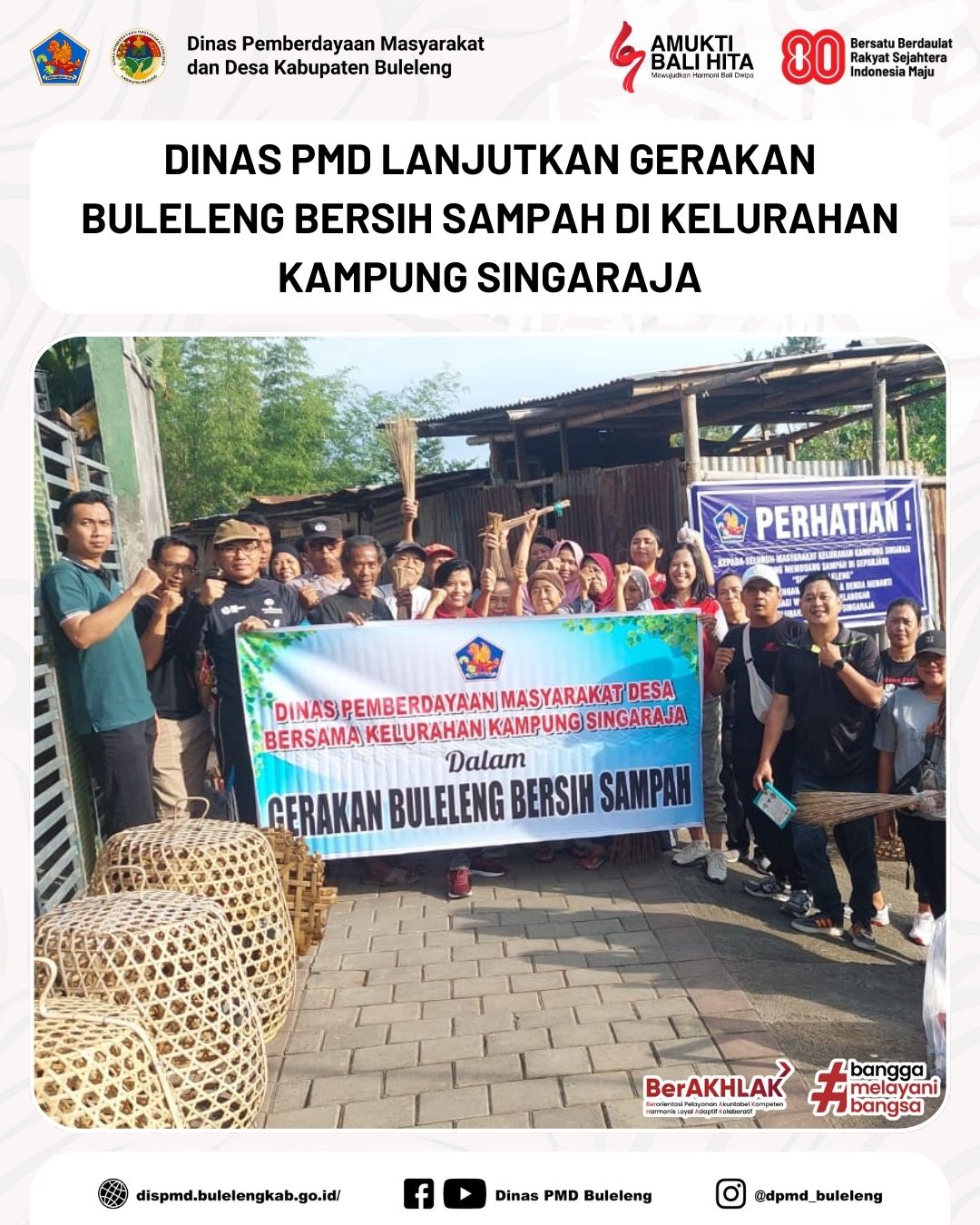 Buleleng, 21 November 2025 - Dinas Pemberdayaan Masyarakat dan Desa (PMD) Kabupaten Buleleng kembali melaksanakan kegiatan pembersihan lingkungan sebagai tindak lanjut Gerakan Buleleng Bersih Sampah. Kegiatan dilaksanakan di wilayah Kelurahan Kampung Singaraja, dimulai dari area perumahan warga hingga ke bantaran sungai.