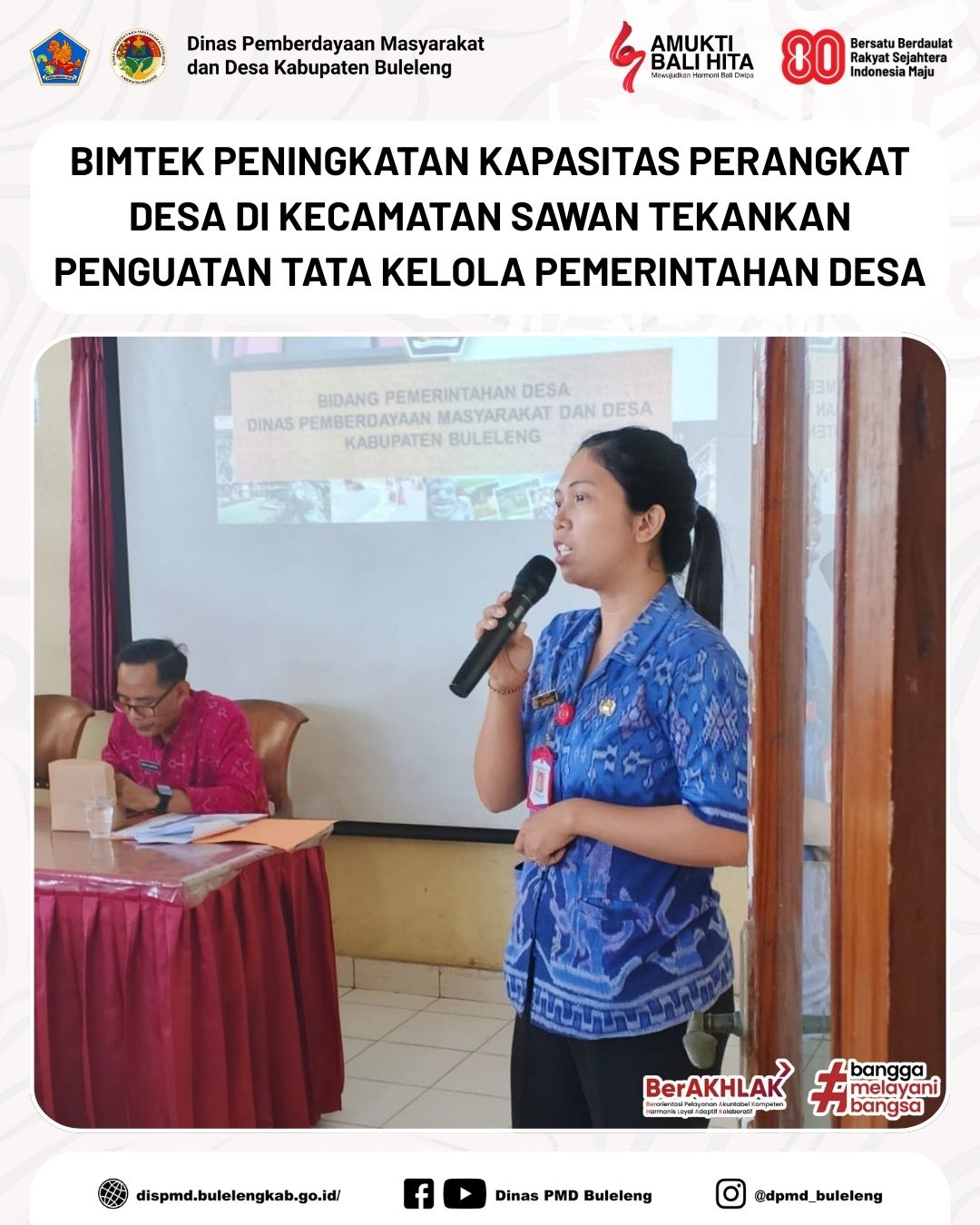 Buleleng, 23 September 2025 - Dinas PMD Kabupaten Buleleng melalui Bidang Pemerintahan Desa (Pemdes) hadir sebagai narasumber dalam kegiatan Bimbingan Teknis (Bimtek) Peningkatan Kapasitas Perangkat Desa yang diselenggarakan oleh Kecamatan Sawan. Kegiatan berlangsung di Ruang Rapat Kantor Camat Sawan dengan menghadirkan peserta dari unsur Sekretaris Desa, Kepala Urusan Keuangan, serta Kepala Urusan Perencanaan Desa se-Kecamatan Sawan.