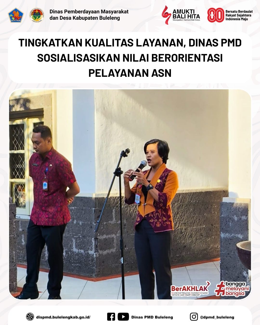 Buleleng, 23 September 2025 - Dinas PMD Kabupaten Buleleng melaksanakan apel pagi di halaman kantor yang dipimpin oleh Kabid PKD, I Rai Gede Arisudana. Apel ini diikuti oleh seluruh pegawai dan diisi dengan sosialisasi nilai ASN BerAKHLAK, sesuai instruksi Plt. Sekdis PMD, Madong Hartono.