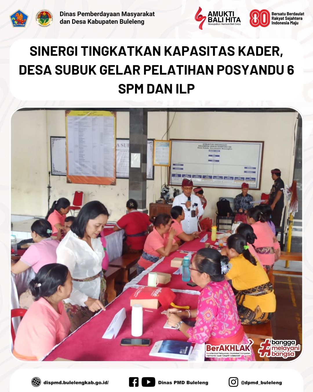 Buleleng, 6 November 2025 - Bidang Lembaga Kemasyarakatan Desa, Adat dan Usaha Ekonomi Masyarakat (LKDA & UEM) Dinas Pemberdayaan Masyarakat dan Desa (PMD) Kabupaten Buleleng menghadiri undangan sebagai narasumber dalam kegiatan Pelatihan Tim Pembina dan Kader Posyandu yang diselenggarakan oleh Pemerintah Desa Subuk. Kegiatan ini dilaksanakan di Gedung Serba Guna Desa Subuk, Kecamatan Busungbiu.
