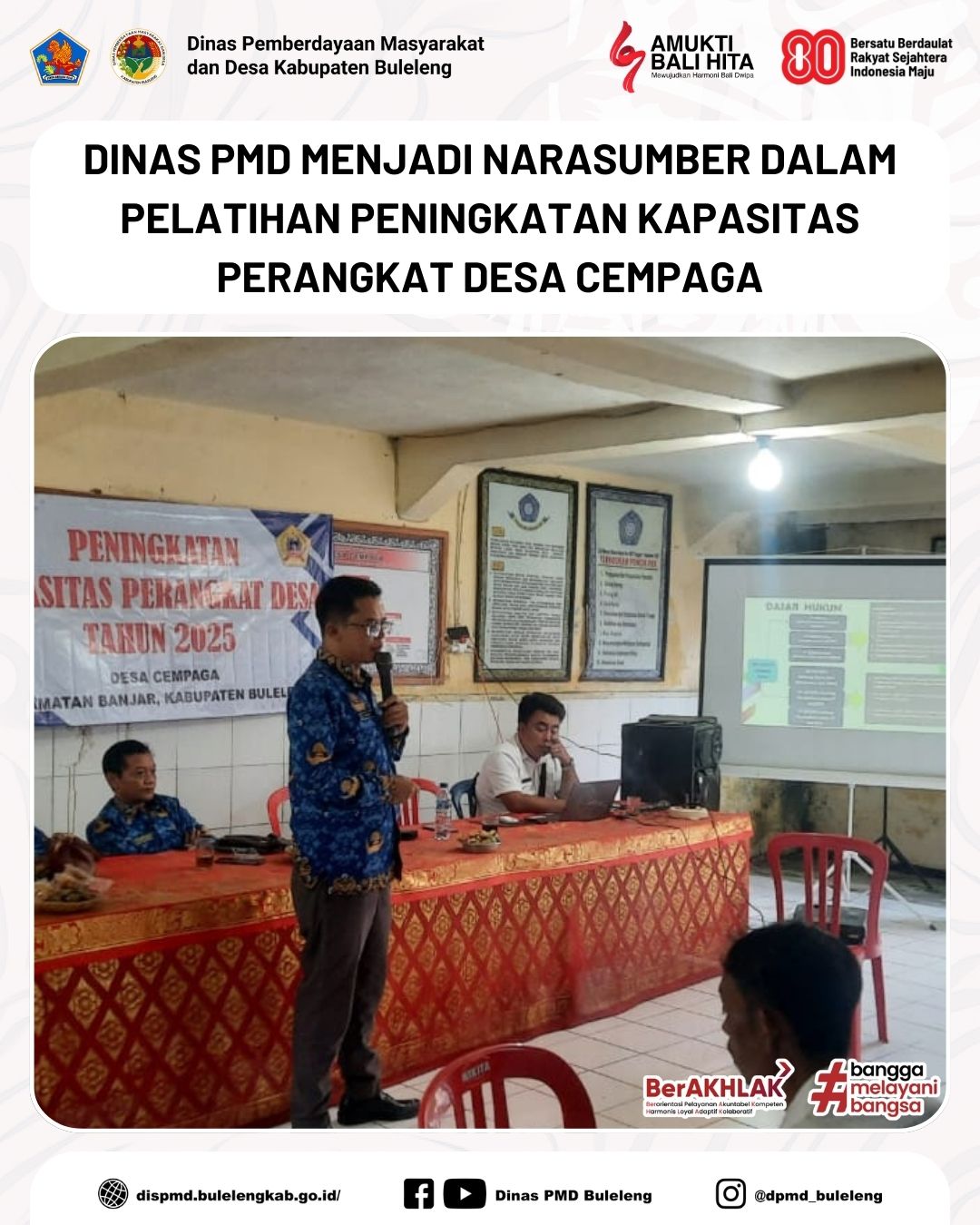 Buleleng, 17 Desember 2025 - Dinas Pemberdayaan Masyarakat dan Desa hadir sebagai narasumber dalam kegiatan Pelatihan Peningkatan Kapasitas Perangkat Desa yang bertempat di Aula Kantor Perbekel Desa Cempaga, Kecamatan Banjar. Pelatihan ini dihadiri oleh Kasi Pemerintahan Kecamatan Banjar, Perbekel Desa Cempaga, perangkat desa, serta staf Desa Cempaga.