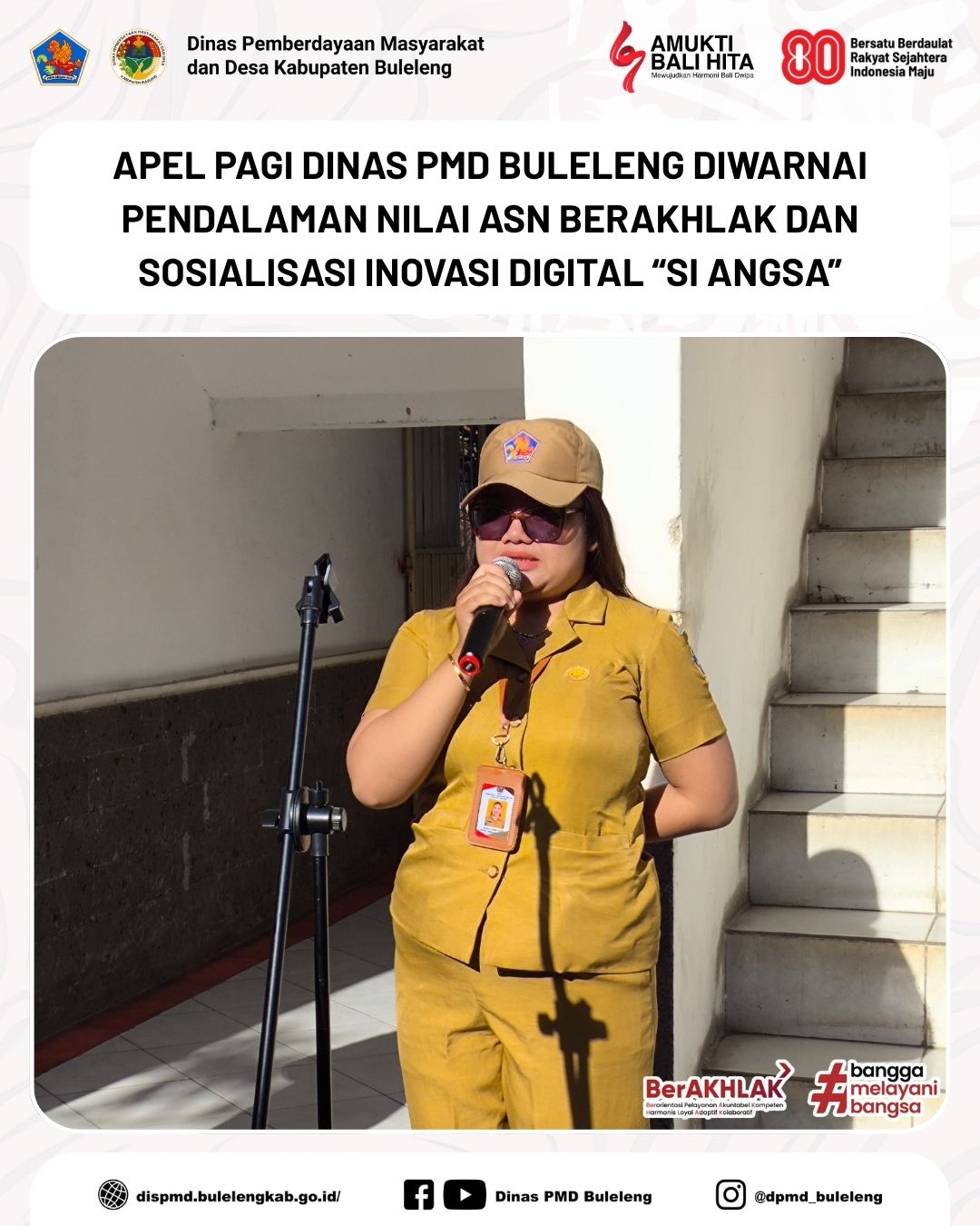Buleleng, 20 Oktober 2025 - Dinas Pemberdayaan Masyarakat dan Desa (PMD) Kabupaten Buleleng pagi ini kembali melaksanakan apel rutin yang berlangsung di halaman kantor Dinas PMD dipimpin oleh Plt. Sekretaris Dinas PMD, Madong Hartono, dan diisi dengan dua agenda utama, yakni pendalaman core values ASN BerAKHLAK serta sosialisasi inovasi digital “SI ANGSA” (Sistem Informasi Pelayanan Masyarakat dan Aparatur Desa).