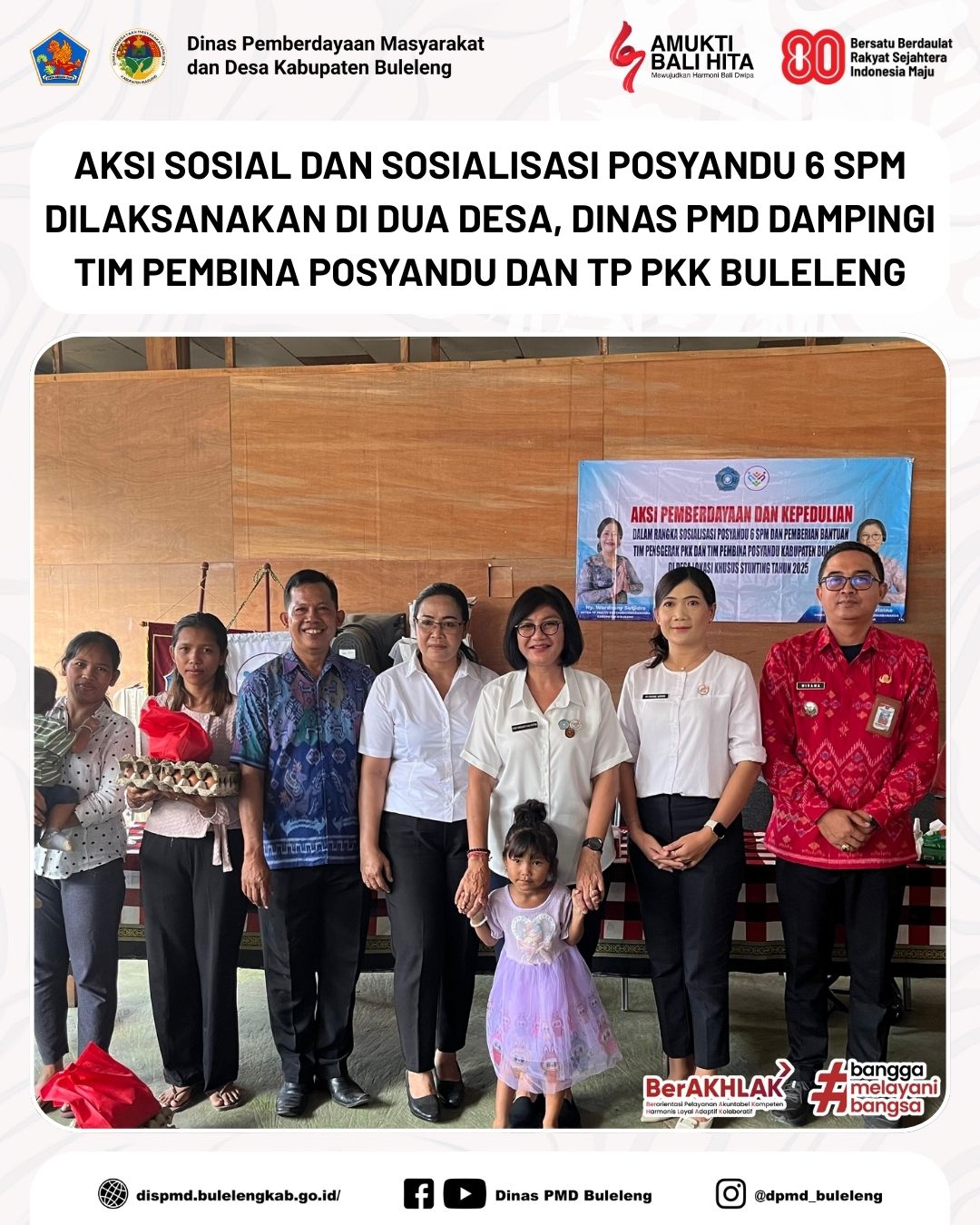 Buleleng, 14 Oktober 2025 - Dinas Pemberdayaan Masyarakat dan Desa (PMD) Kabupaten Buleleng kembali menunjukkan komitmennya dalam mendukung peningkatan pelayanan dasar masyarakat melalui kegiatan “Aksi Sosial dan Sosialisasi Posyandu 6 Standar Pelayanan Minimal (SPM)”. Kegiatan ini dilaksanakan di Dua Desa, yakni Desa Sekumpul, Kecamatan Sawan dan Desa Silangjana, Kecamatan Sukasada, pada Selasa (14/10).