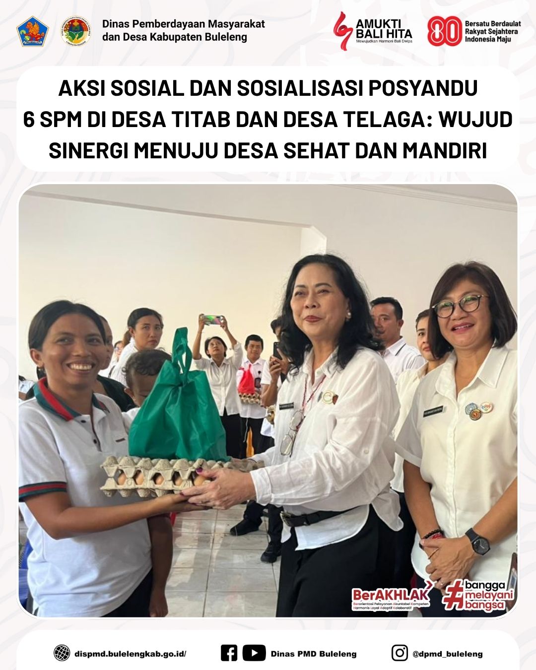 Buleleng, 8 Oktober 2025 - Tim Pembina Posyandu bersama Dinas Pemberdayaan Masyarakat dan Desa (PMD) serta Tim Penggerak PKK Kabupaten Buleleng melaksanakan kegiatan “Aksi Sosial dan Sosialisasi Posyandu 6 SPM” di dua desa, yakni Desa Titab dan Desa Telaga, Kecamatan Busungbiu.