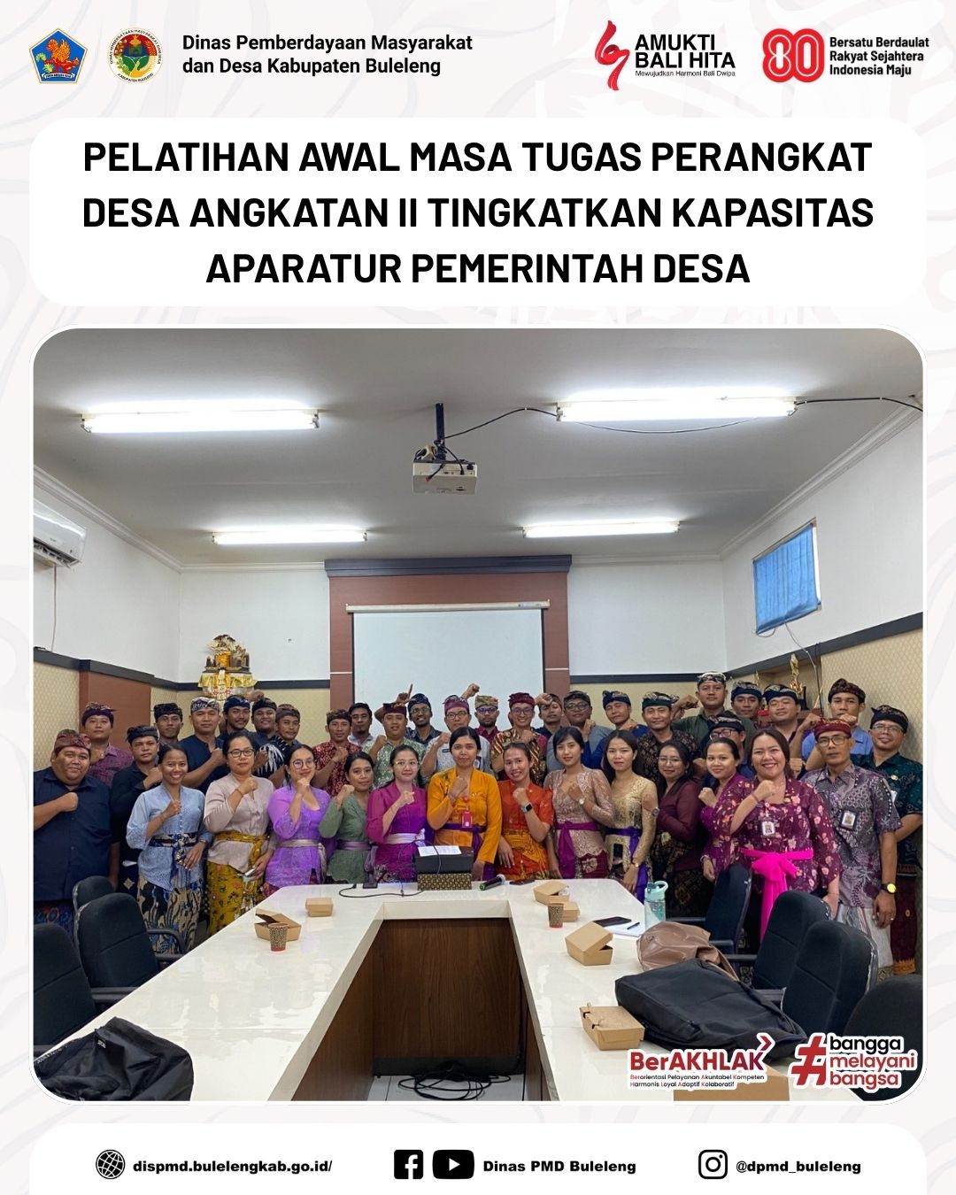 Buleleng, 2 Oktober 2025 - Dinas Pemberdayaan Masyarakat dan Desa (PMD) Kabupaten Buleleng melalui Bidang Pemerintahan Desa kembali menyelenggarakan Pelatihan Awal Masa Tugas Perangkat Desa Angkatan II. Kegiatan ini berlangsung selama tiga hari, mulai Selasa hingga Kamis, 30 September hingga 2 Oktober 2025, bertempat di Ruang Rapat Dinas PMD Kabupaten Buleleng.