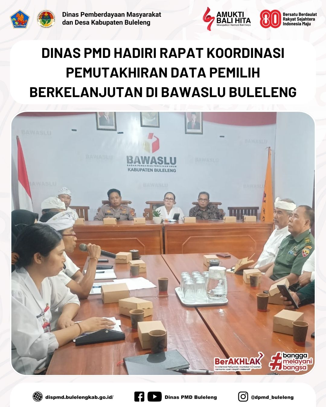 Buleleng, 5 November 2025 - Dinas Pemberdayaan Masyarakat dan Desa (PMD) Kabupaten Buleleng melalui Bidang Pemerintahan Desa menghadiri Rapat Koordinasi Pemutakhiran Data Pemilih Berkelanjutan (PDPB) yang bertempat di Ruang Rapat Kantor Sekretariat Bawaslu Kabupaten Buleleng. Dinas PMD diwakili oleh Luh Wartami, Penelaah Teknis Kebijakan pada Bidang Pemerintahan Desa.