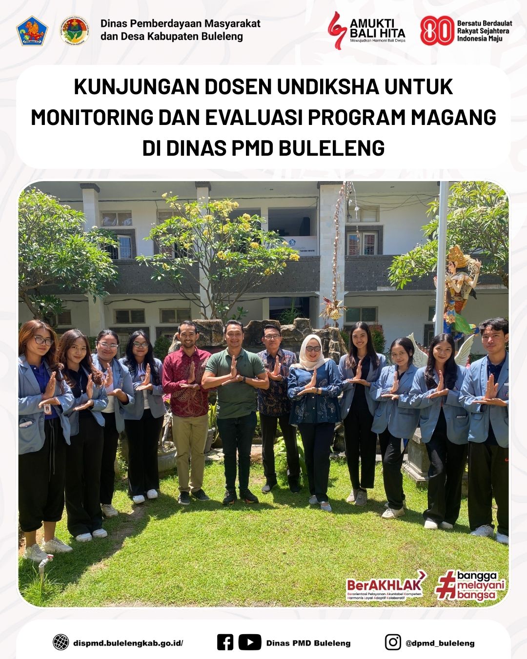 Buleleng, 19 September 2025 - Dinas Pemberdayaan Masyarakat dan Desa (PMD) Kabupaten Buleleng menerima kunjungan tim dosen dari Universitas Pendidikan Ganesha (Undiksha) dalam rangka kegiatan monitoring dan evaluasi terhadap program magang mahasiswa yang berlangsung sejak 25 Agustus 2025. Kegiatan ini bertujuan untuk memastikan pelaksanaan program magang sesuai dengan tujuan yang telah ditetapkan, sekaligus meninjau secara langsung proses pembelajaran yang dialami mahasiswa di lingkungan kerja instansi pemerintah.