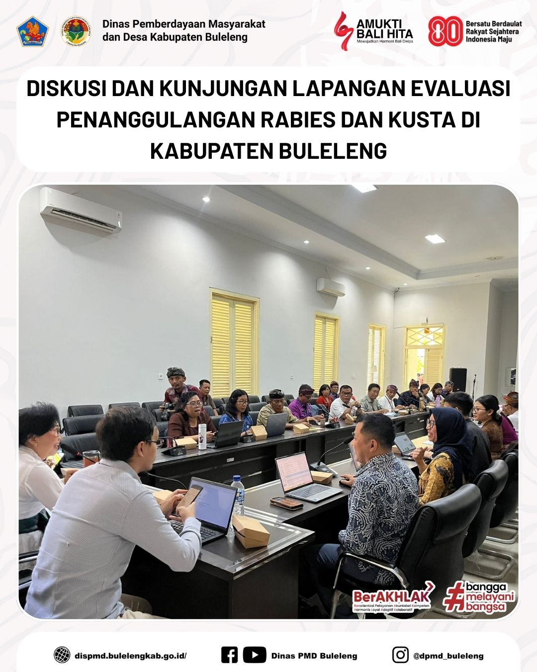 Buleleng, 18 September 2025 - Dinas Pemberdayaan Masyarakat dan Desa (PMD) Kabupaten Buleleng melalui Staf Bidang Pemdes, Luh Wartami dan Kadek Desi Ariani, menghadiri kegiatan Diskusi dan Kunjungan Lapangan Evaluasi Upaya Penanggulangan Rabies dan Kusta di Kabupaten Buleleng. Kegiatan berlangsung di Ruang Rapat Bappeda Kabupaten Buleleng.
